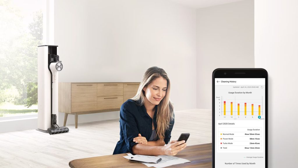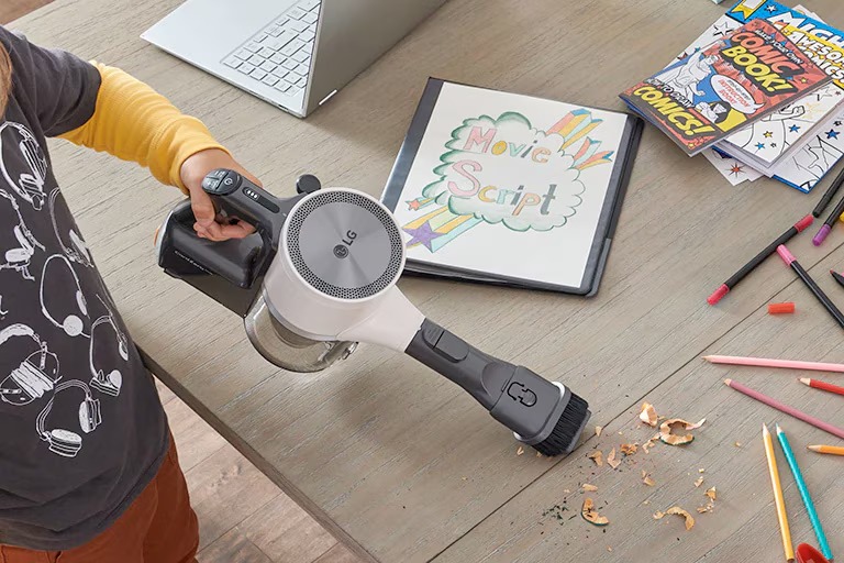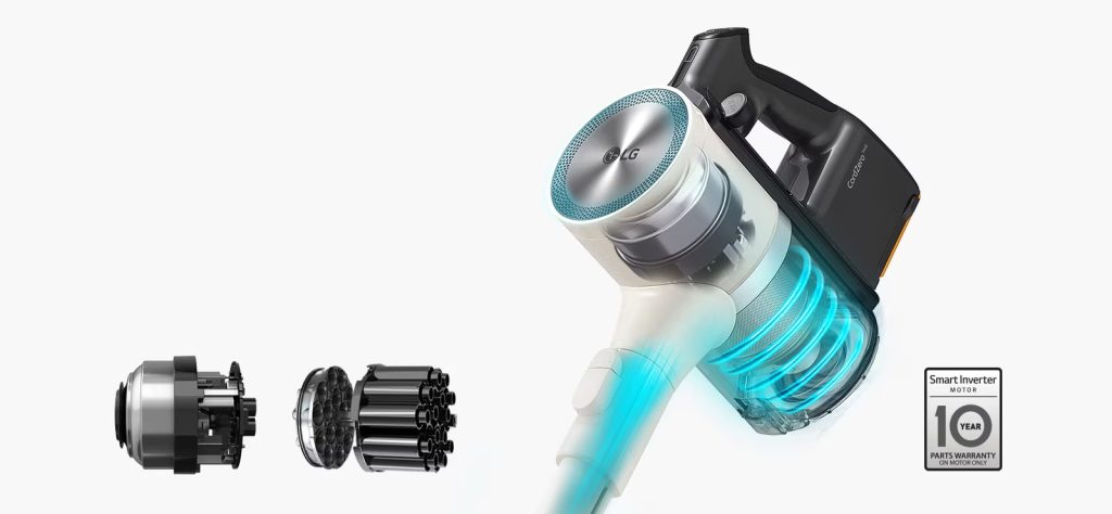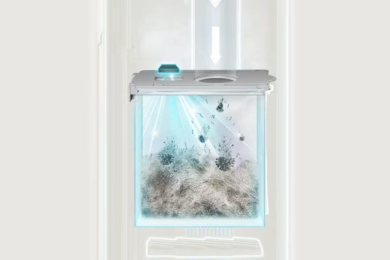 Teknologi LG KOMPRESSOR™ menjimatkan masa anda dengan memampatkan habuk dan rambut yang terkumpul di dalam tong sampah.