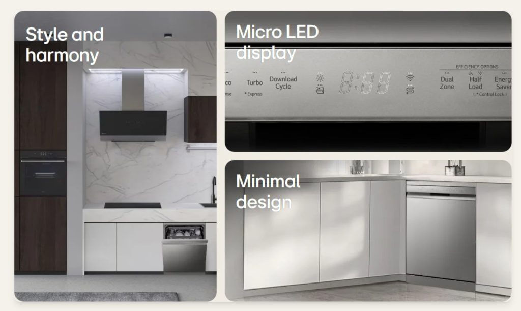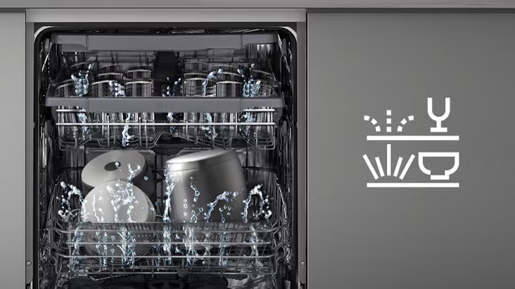 QuadWash™ menggunakan empat lengan penyembur berarah pelbagai untuk membersihkan setiap sudut dengan menyeluruh, manakala Dual Zone Wash membolehkan anda memilih tahap tekanan berbeza untuk setiap rak.