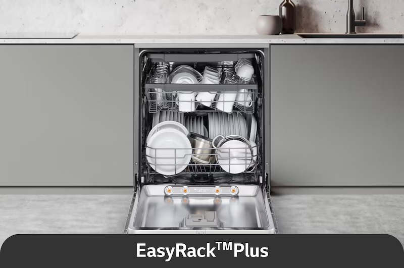 Nikmati ruang yang lebih mudah diatur dengan EasyRack™Plus — rak atas yang boleh dilaras ketinggiannya dan rak bawah dengan penyokong boleh lipat, memudahkan anda memuatkan pelbagai jenis pinggan mangkuk.