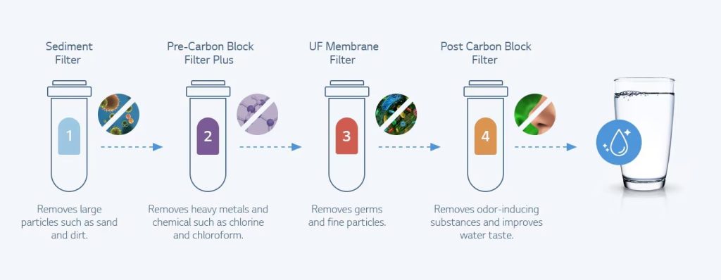 LG PuriCare™ S2 menampilkan penapisan 4 peringkat yang menghapuskan mikroorganisma dan 7 jenis logam berat*. Sistem inovatif secara berkesan membuang zarah dan bakteria berbahaya sambil menyampaikan air yang paling tulen.