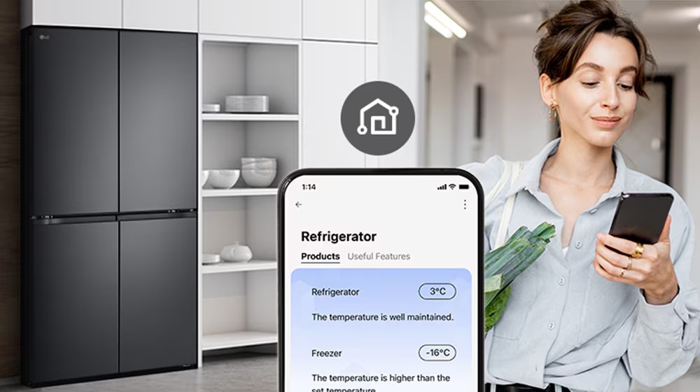 Aplikasi LG ThinQ™ memberikan anda pemantauan peti sejuk pintar dan membolehkan anda mengaktifkan ciri ‘Express Freeze’ dengan hanya ketik butang.
